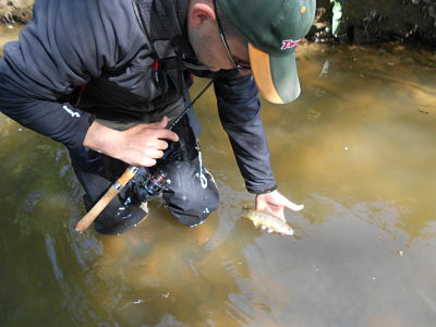 Commençons par la période qui s’étend de l’ouverture jusqu’à la fin avril. A cette période les eaux sont froides et les niveaux sont souvent hauts. Selon les conditions, ce n’est pas toujours la période optimale pour rechercher les truites aux leurres. Lors de cette période, j’ai parfois tendance à rechercher les truites au toc ou au vairon mais j’arrive quand même à décider quelques mouchetées en péchant au leurre lentement et près du fond. A cette époque, je recherche plutôt dans les amortis ou dans les calmes, là où les demoiselles n’ont pas d’efforts à faire pour lutter contre le courant. A cette période, je privilégie les périodes les plus « chaudes » de la journée, c’est à dire entre 10h et 15h et surtout les journées de soleil et avec peu de vent. Le wadding étant interdit dans ma région jusqu’au 1er mai, j’arpente les berges discrètement, approchant même certains postes à quatre pattes de façon à ne pas être repéré.