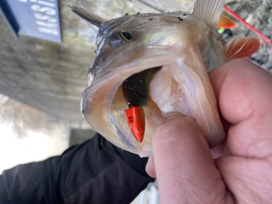 C’est ensuite au tour de Andy de répliquer avec son premier poisson sur une Tenryu Fast Finess M: une superbe perche prise au Bakuree 110 combiné à une Bakuree Head en 8 grammes.