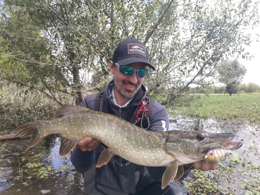 Premier lancer et en arrivant dans mes pieds, je sors le leurre classiquement de l’eau quand je vois une caudale de brochet se retourner gentiment. Outchh lui il est solide ! Je n’ai pas bougé, les eaux sont chargées, avec un peu de chance il n’est pas loin. Je continue de lancer mais surtout je prends bien la peine de faire passer le leurre bien devant moi, quand soudain au 3ème passage, je vois mon leurre disparaitre et un flanc se retourner. Accélérations du rythme cardiaque garanti !
