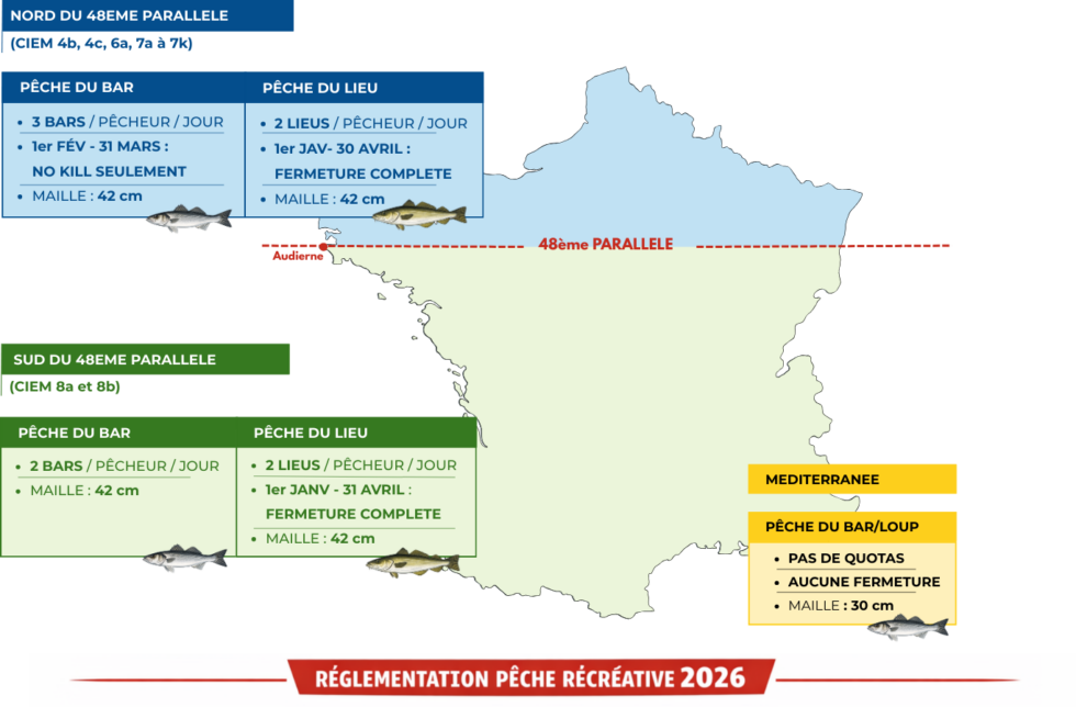 Après deux années de stabilité, quelques assouplissements de quotas sur le bar sont actés, aussi bien au nord qu’au sud du 48ᵉ parallèle, sans remise en cause des tailles minimales ni des périodes de fermeture/no kill déjà en place.
