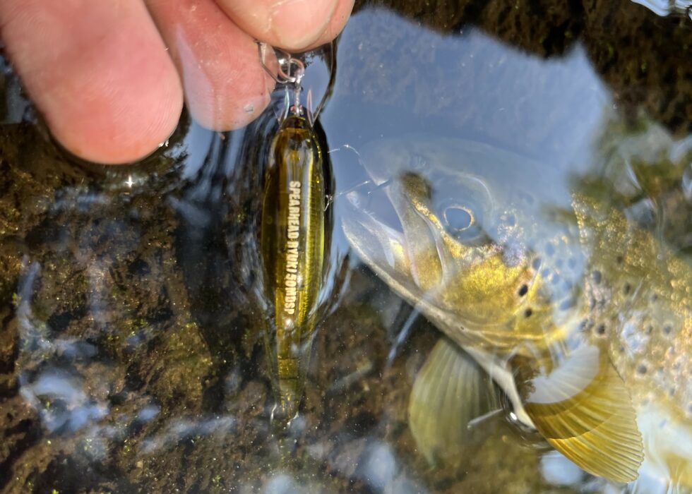 Ces techniques de pêche sont souvent déterminantes en début de saison, lorsque les eaux froides rendent les poissons plus calmes et engourdis. Il faut parfois stimuler leur agressivité plus longtemps pour provoquer l’attaque tant attendue. Un vrai plaisir de pêche ! Ce fut le cas pour réussir à leurrer cette belle truite, plutôt lente, positionnée sur une platière où le courant restait calme et s’écoulait entre quelques postes bien marqués :